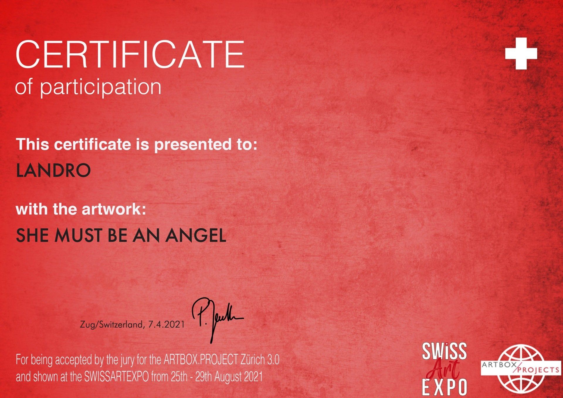 ARTBOX.PROJECTS ZÜRICH 3.0 | SWISSARTEXPO 2021 | Certificate of participation
