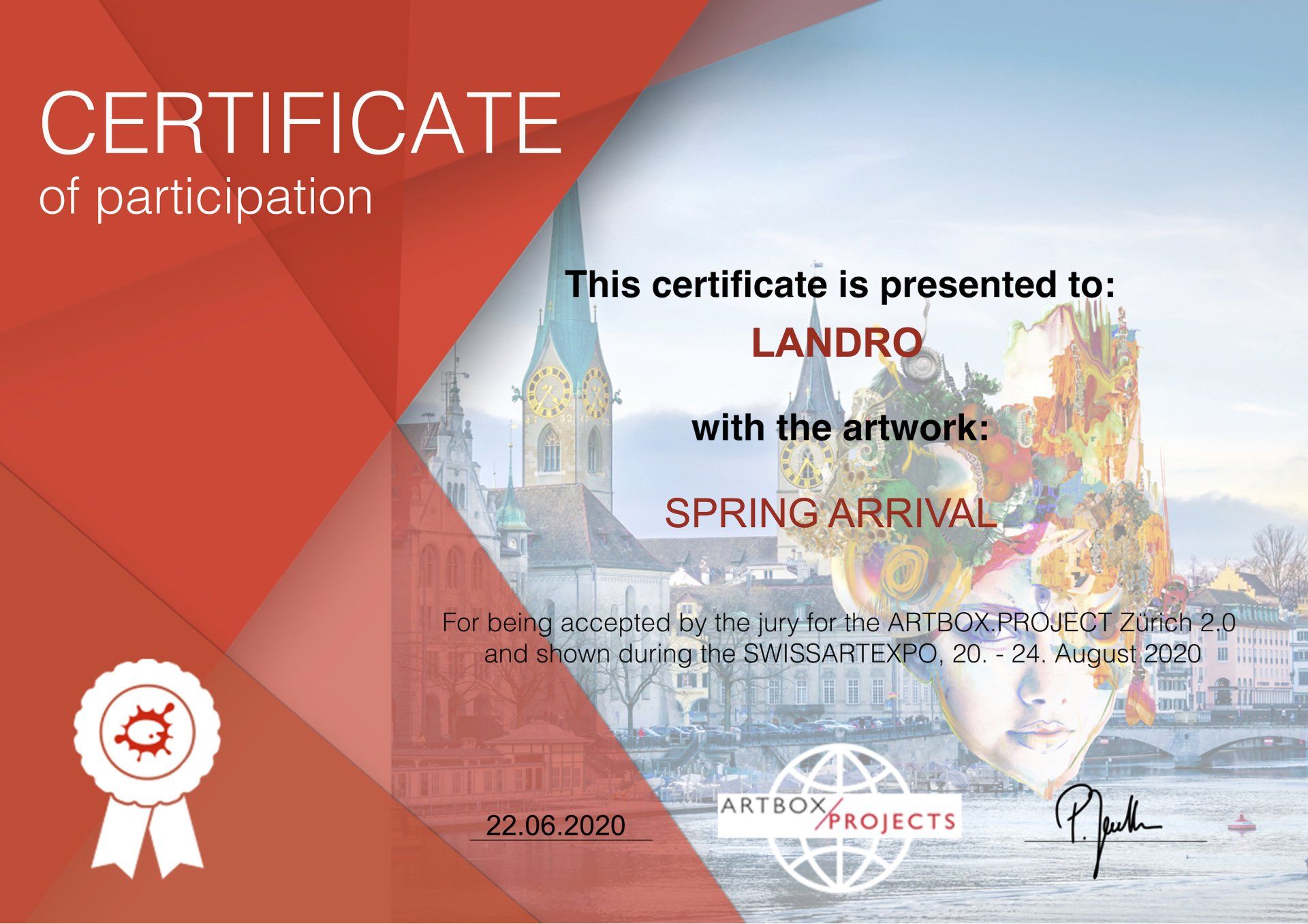 ARTBOX.PROJECTS ZÜRICH 2.0 | SWISSARTEXPO 2020 | Certificate of participation